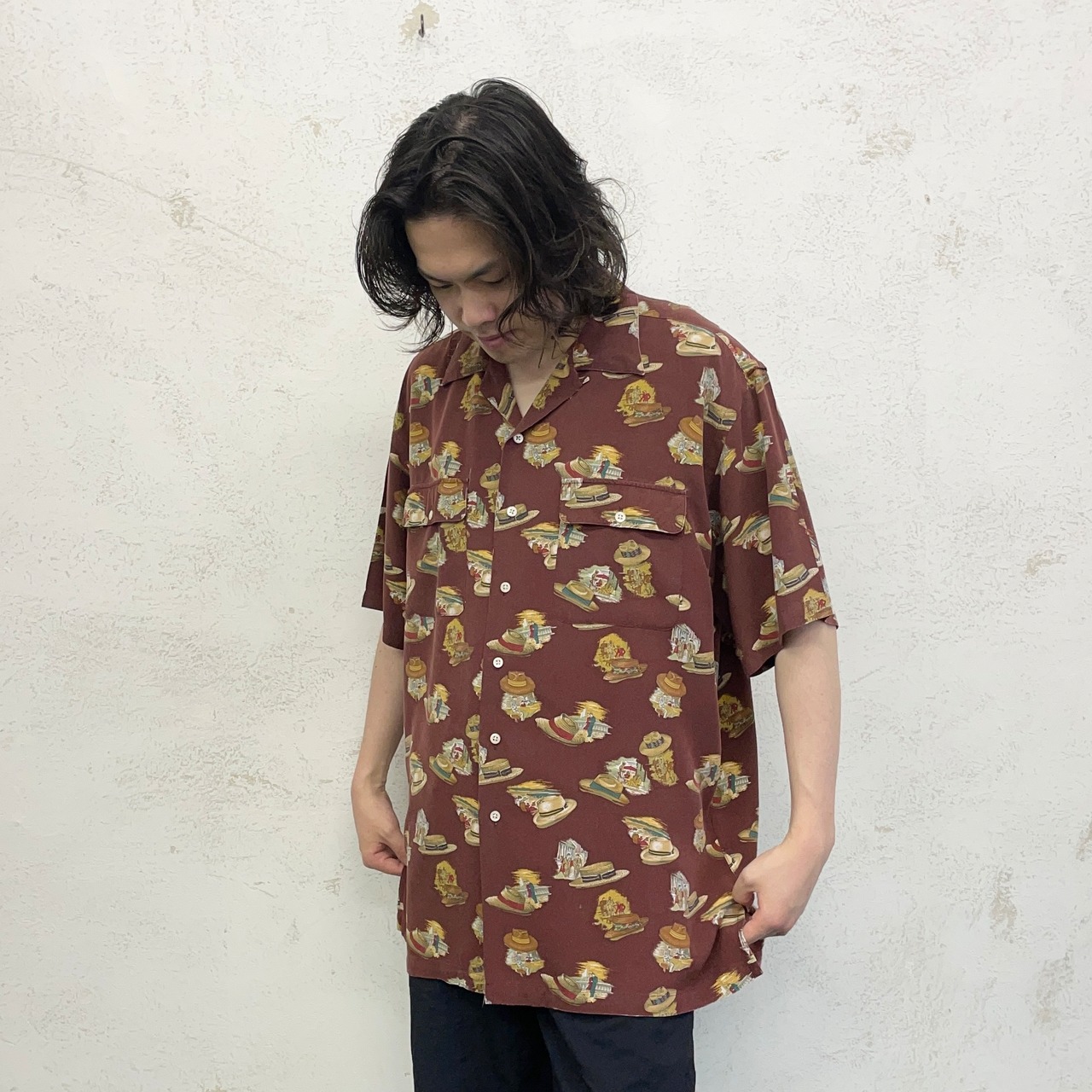 レーヨン素材100%の開襟シャツ。