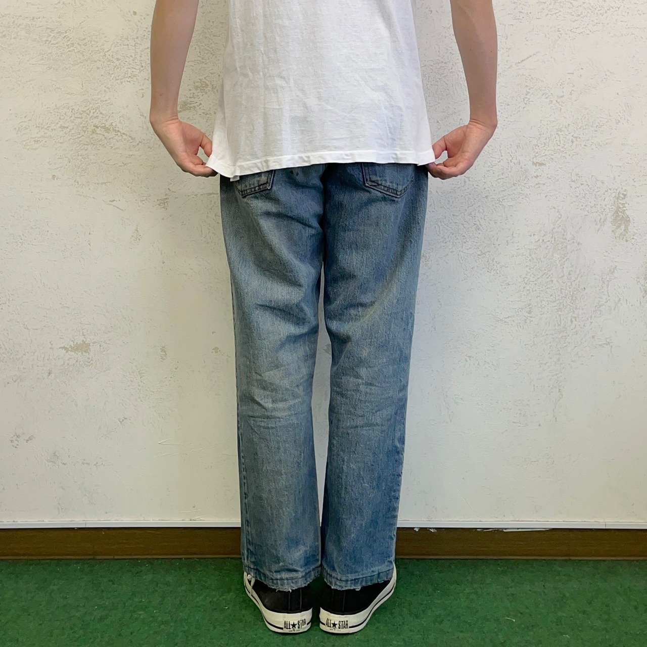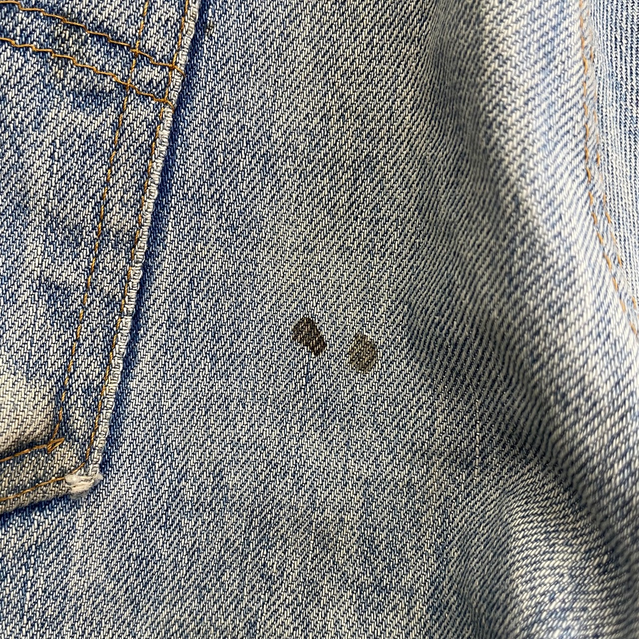 両裾の擦れ、フロント右ポケットにリペア痕、バックポケット横に汚れがあります。(画像14枚目〜17枚目でご確認ください)