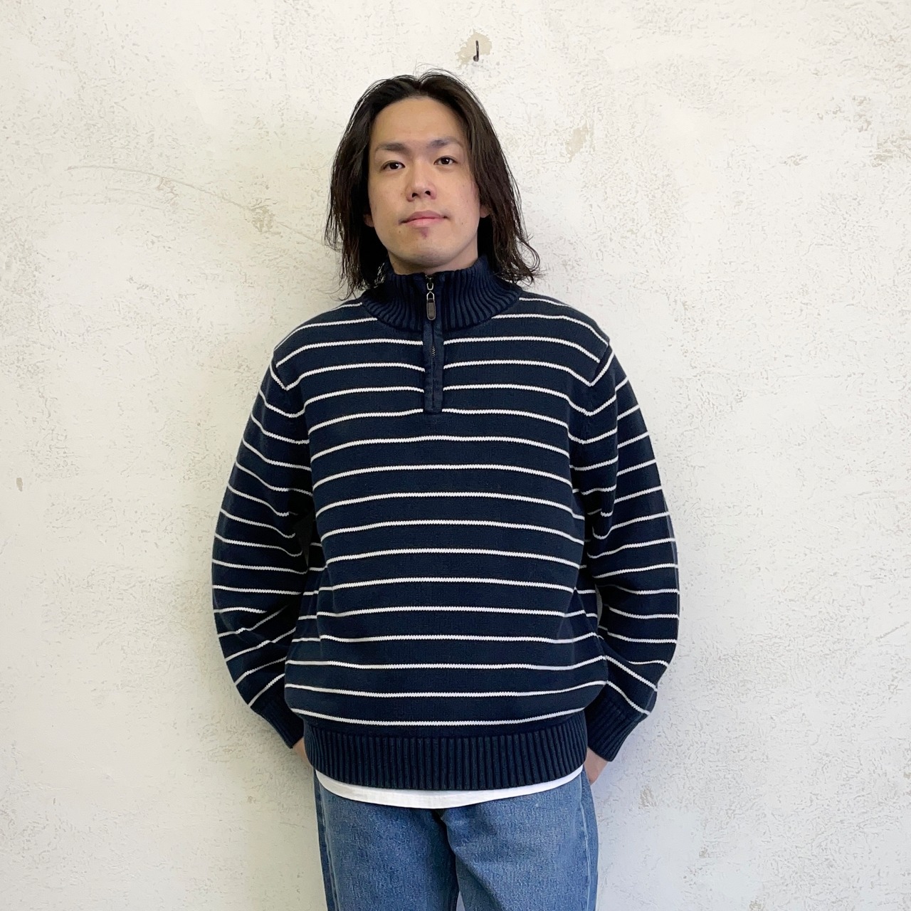 無地の印象が強いボーダーのハーフジップ。